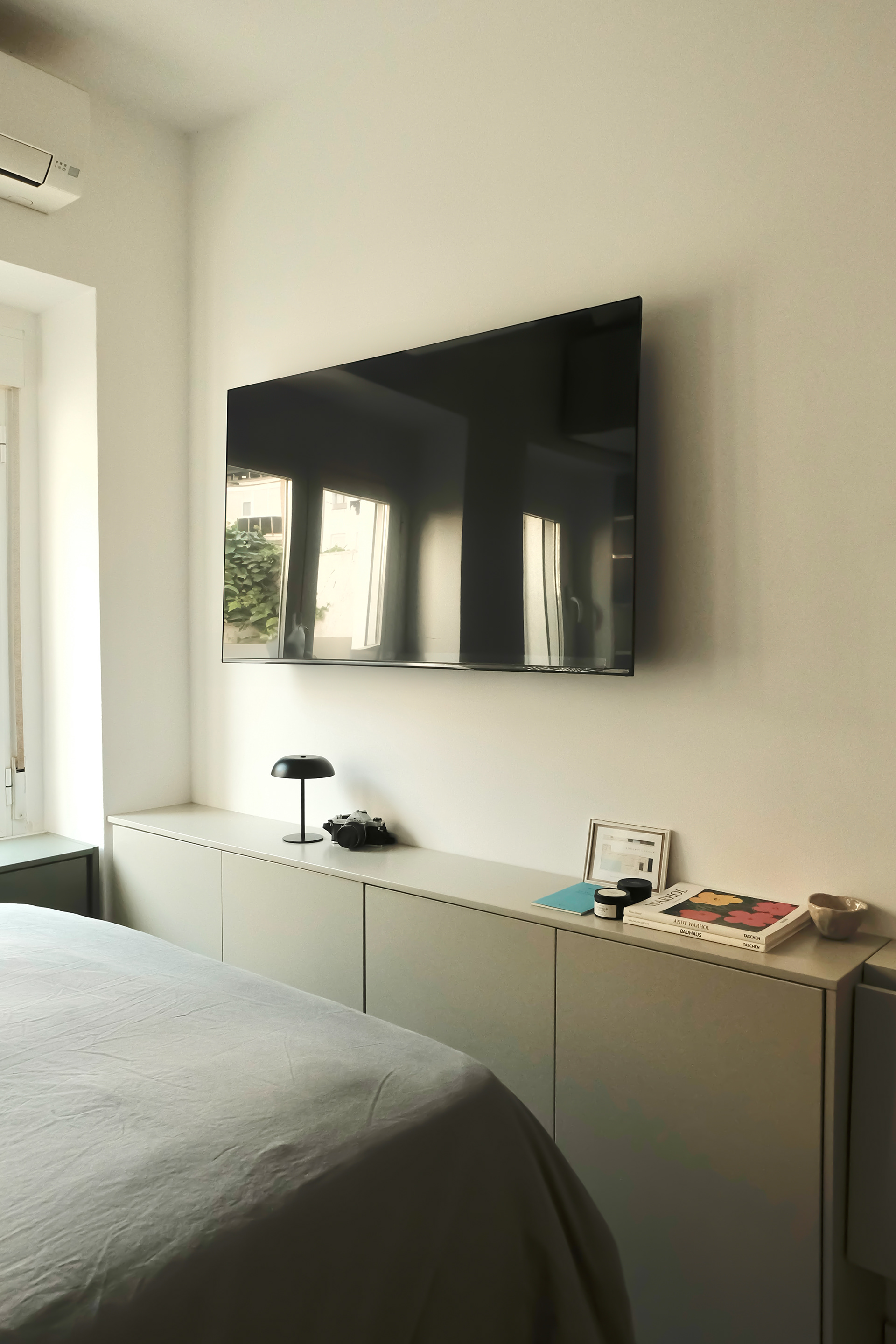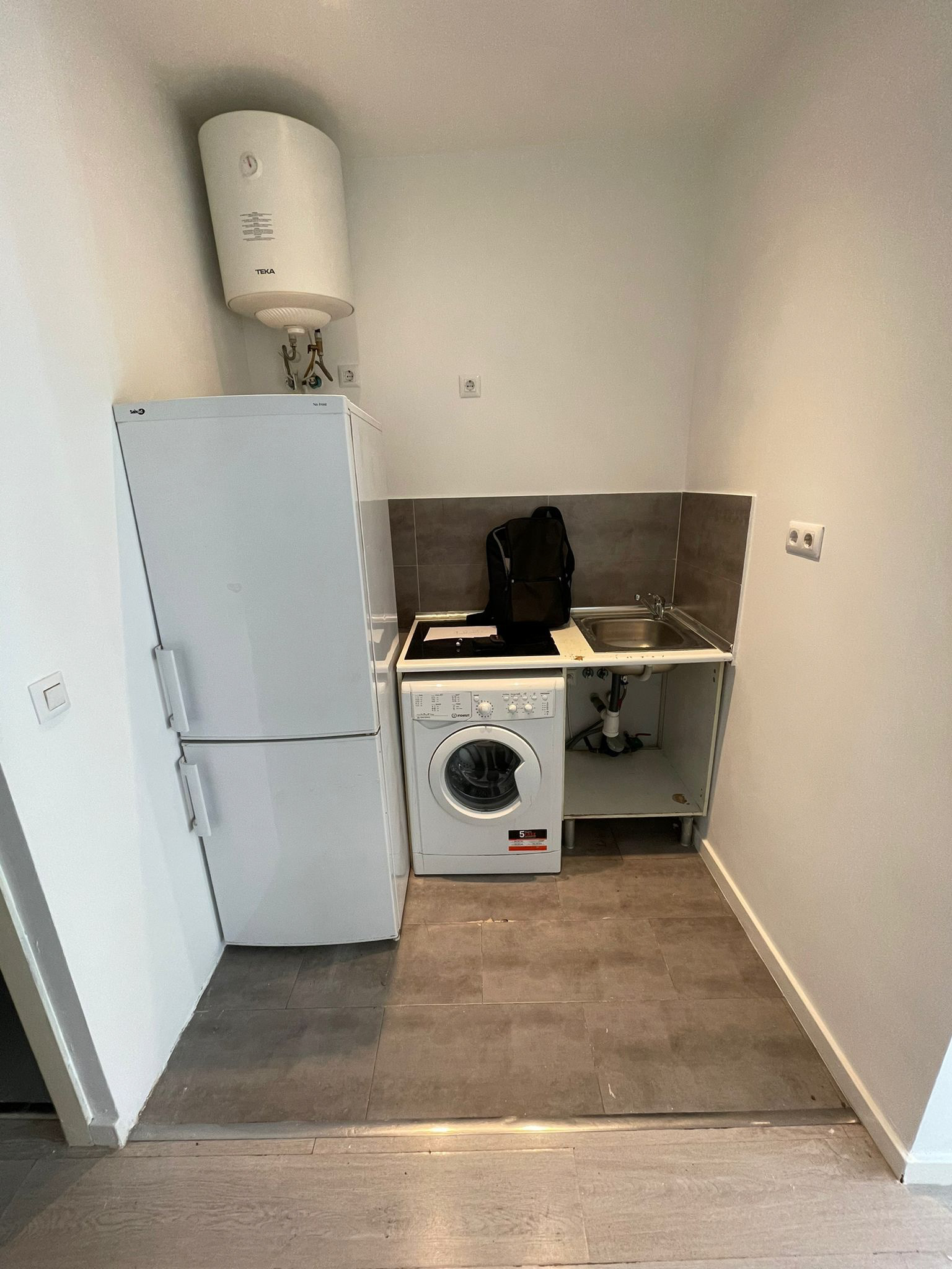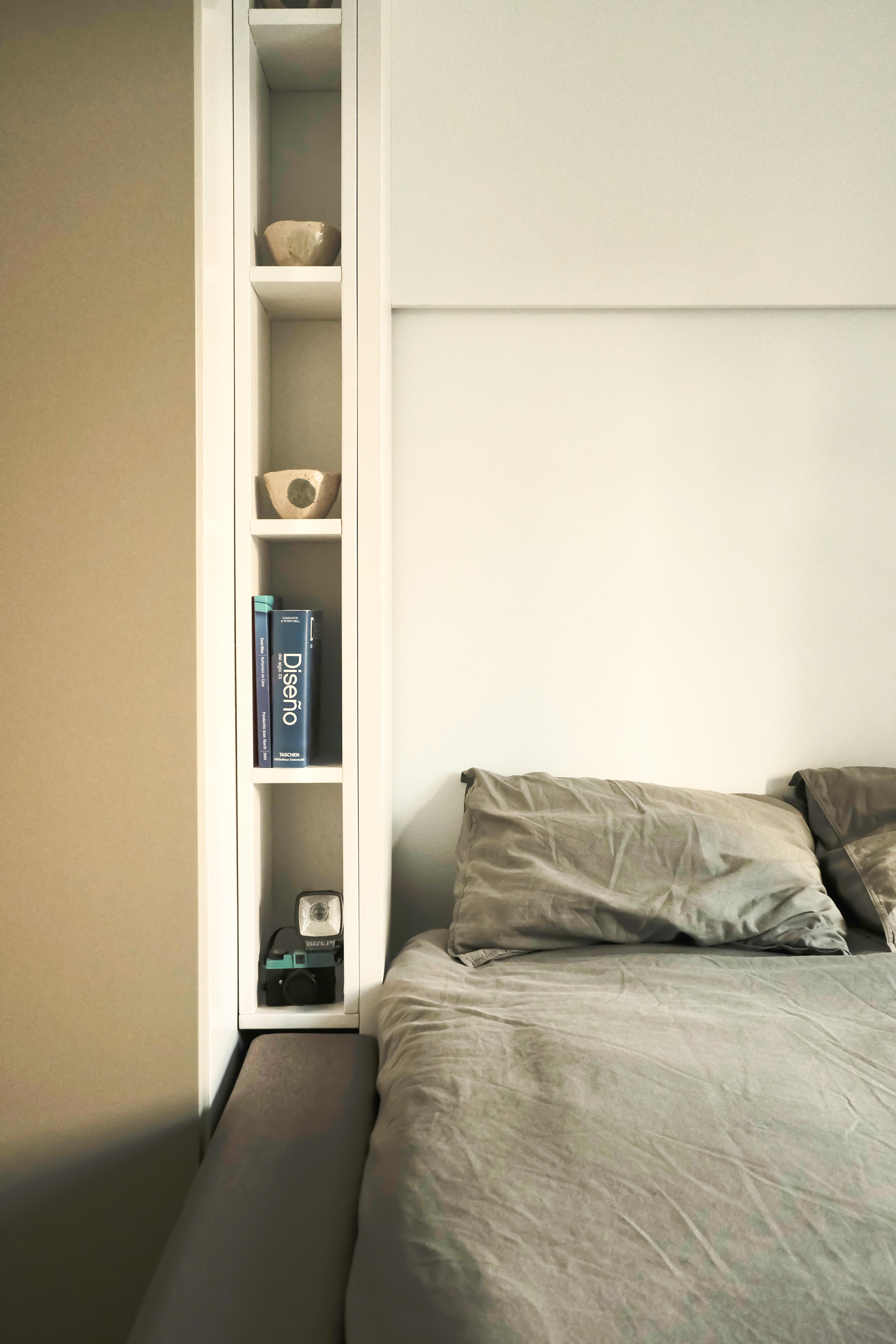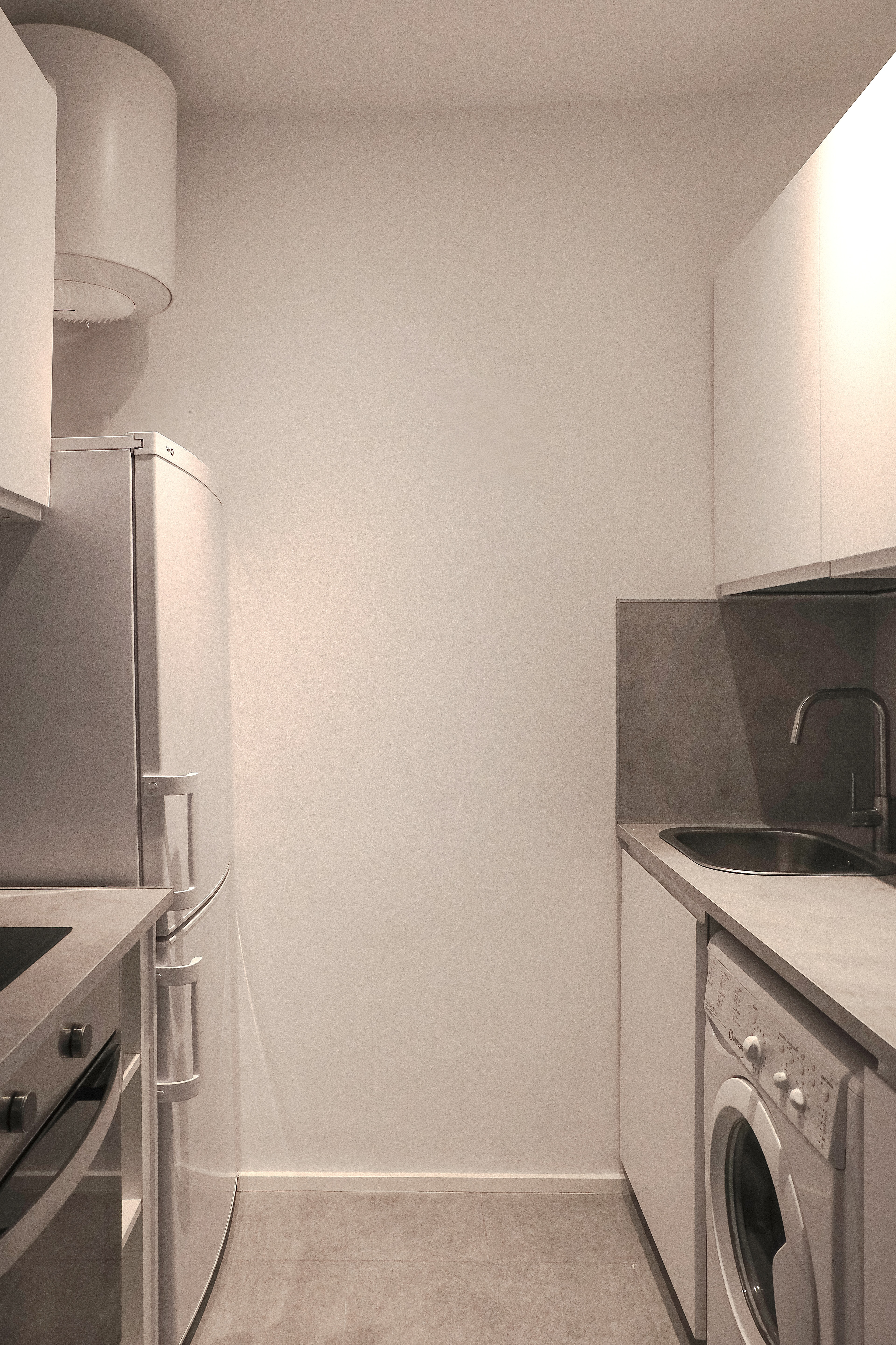 Un piso pequeño de 20m2, pero con muchas posibilidades. Este proyecto comenzó siendo un "lavado de cara" hasta que vimos el potencial de lo que podíamos hacer. Demoliendo el tabique que separaba el baño de la cocina, logramos ampliar al doble de funcionalidad la cocina existente. Quitamos unos pocos cm al baño, aprovechamos para resolver las instalaciones que no estaban empotradas, elegimos revestimientos más claros para una mayor luminosidad y cambiamos todos los sanitarios. De esta forma, la cocina, pasó de tener hueco para la nevera, placa, fregadero y lavadora a una cocina completa con horno y con mucho más espacio de guardado. En el espacio principal, logramos un salón/habitación con un sofá con cama abatible y armarios y mesas abatibles realizados a medida para sacar el máximo beneficio a los metros que teníamos.